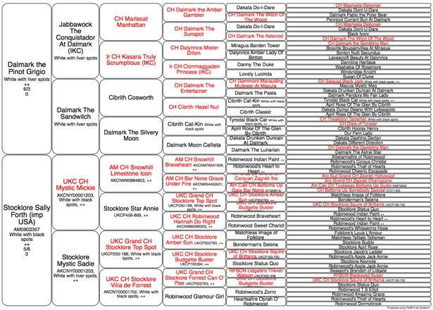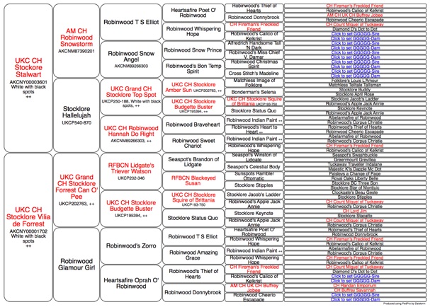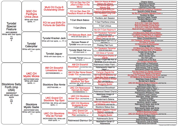 His parents are Champion Stocklore Stalwart and Champion Vilia de Forrest. He has a full dentition and bilateral hearing. He was one of seven all with bilateral hearing. His dam was one of six, all with bilateral hearing. His sire is bilateral and was one of six, of which five were bilateral and one unilateral. He carries one copy of the normal uric acid gene. He has been hip and elbow scored (see below). He is also DNA profiled and does not carry the lemon gene.