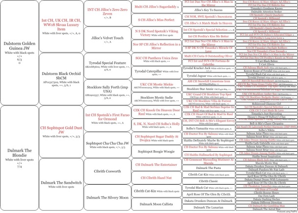 Seven is granddaughter of our lovely Merlin. She has wonderful construction, movement and temperament and has been shown with success. She carries two copies of the LUA gene and will therefore produce all LUA puppies, some of whom will be homozygous like her. She has also been hip and elbow scored and is clear of other testable genetic diseases by parentage. Both parents have strong backgrounds of good hearing.